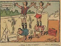 Γελοιογραφία εποχής για την άνοδο της ποδοσφαιρικής ομάδας Τρικάλων στην Α εθνική